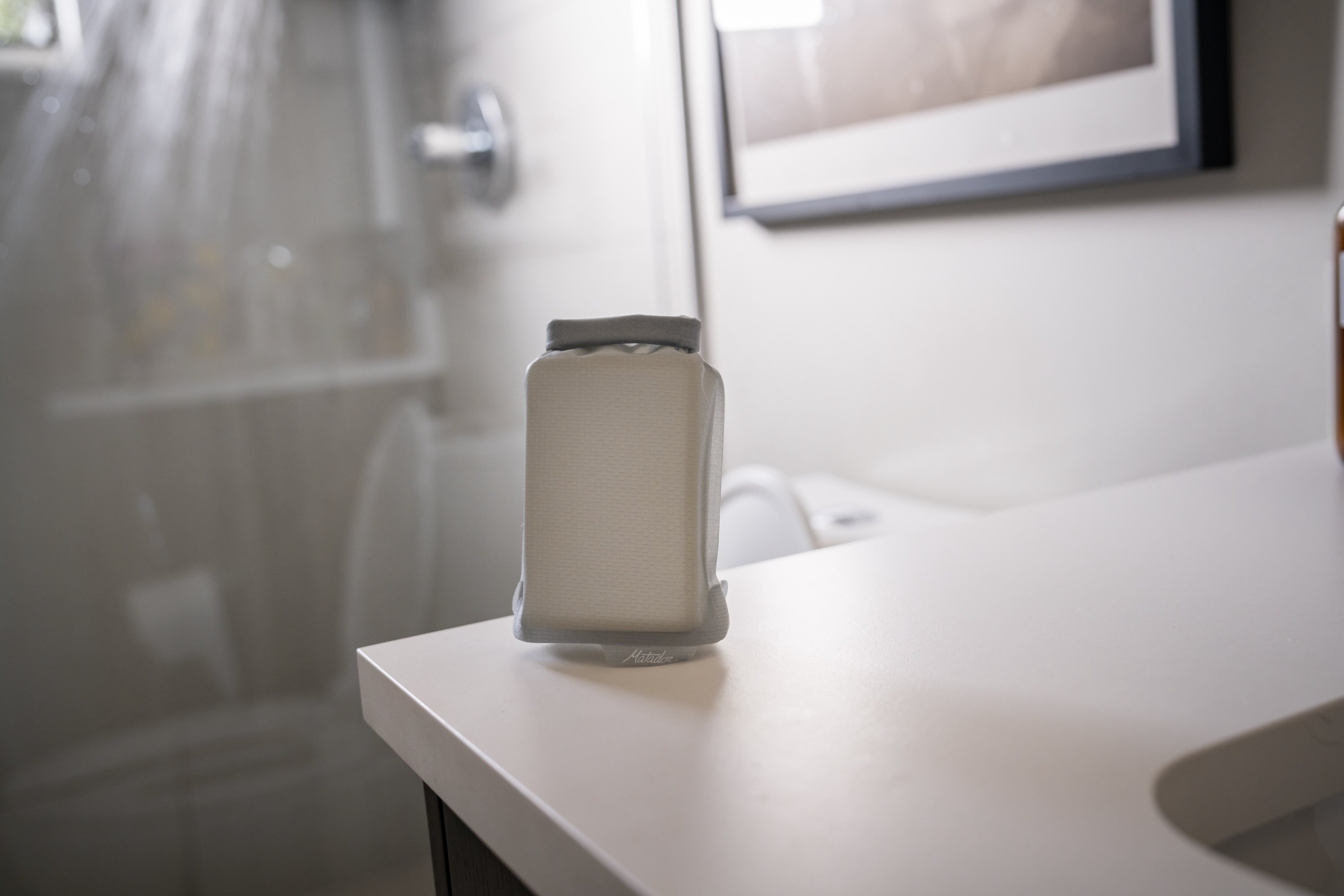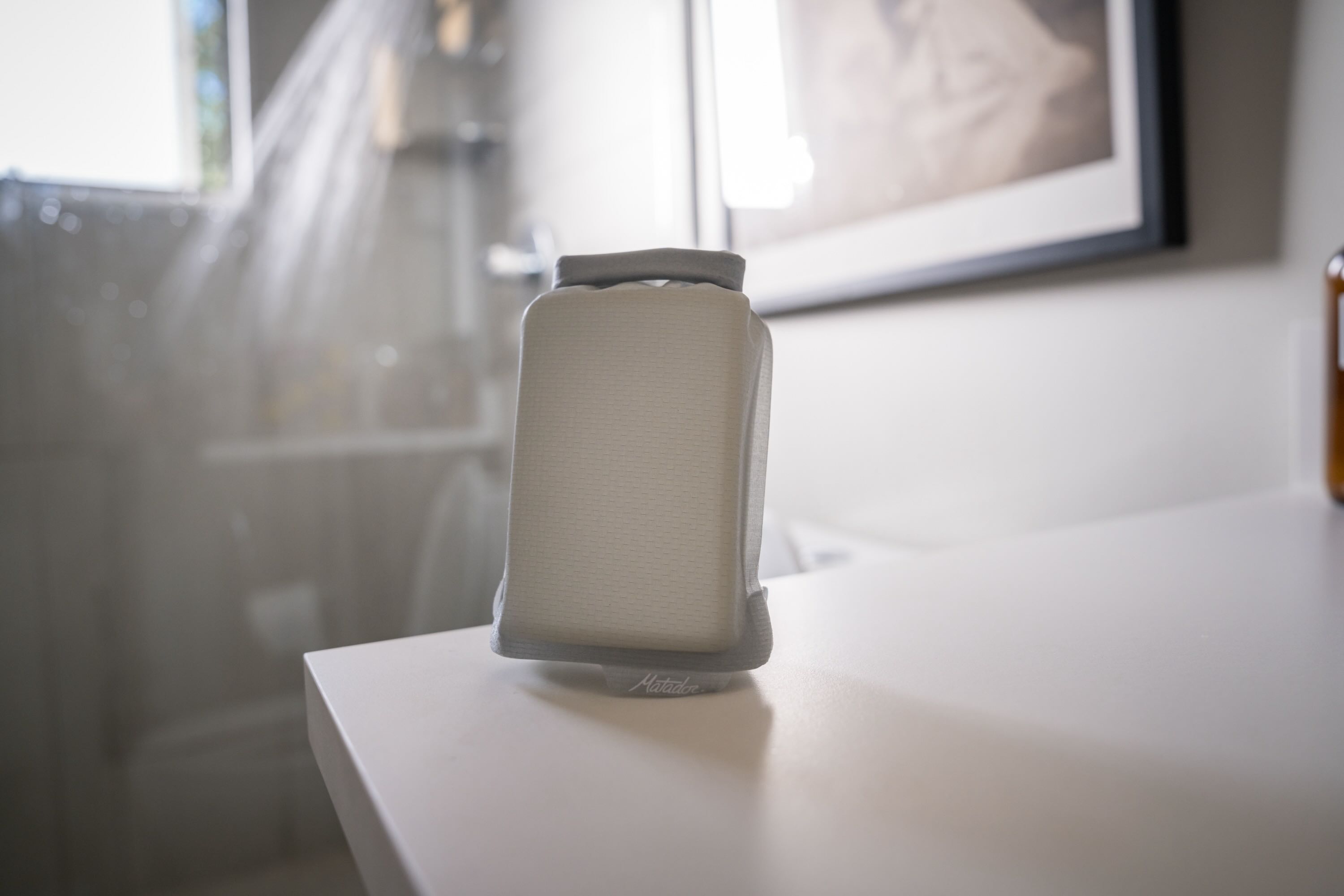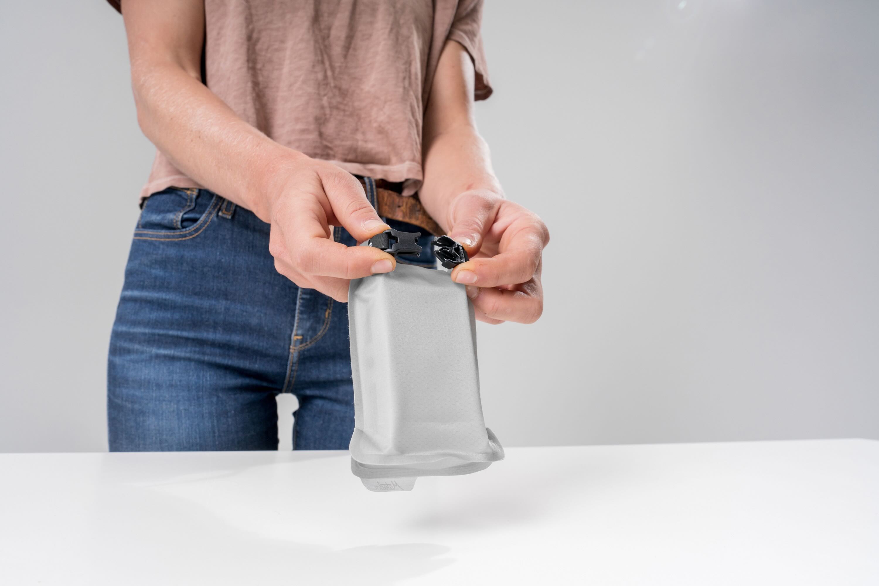 Das geschweißte Rolltop-Design hält Wasser im Inneren, sodass Sie mit Seifenstücken reisen können und es nie auslaufen wird.