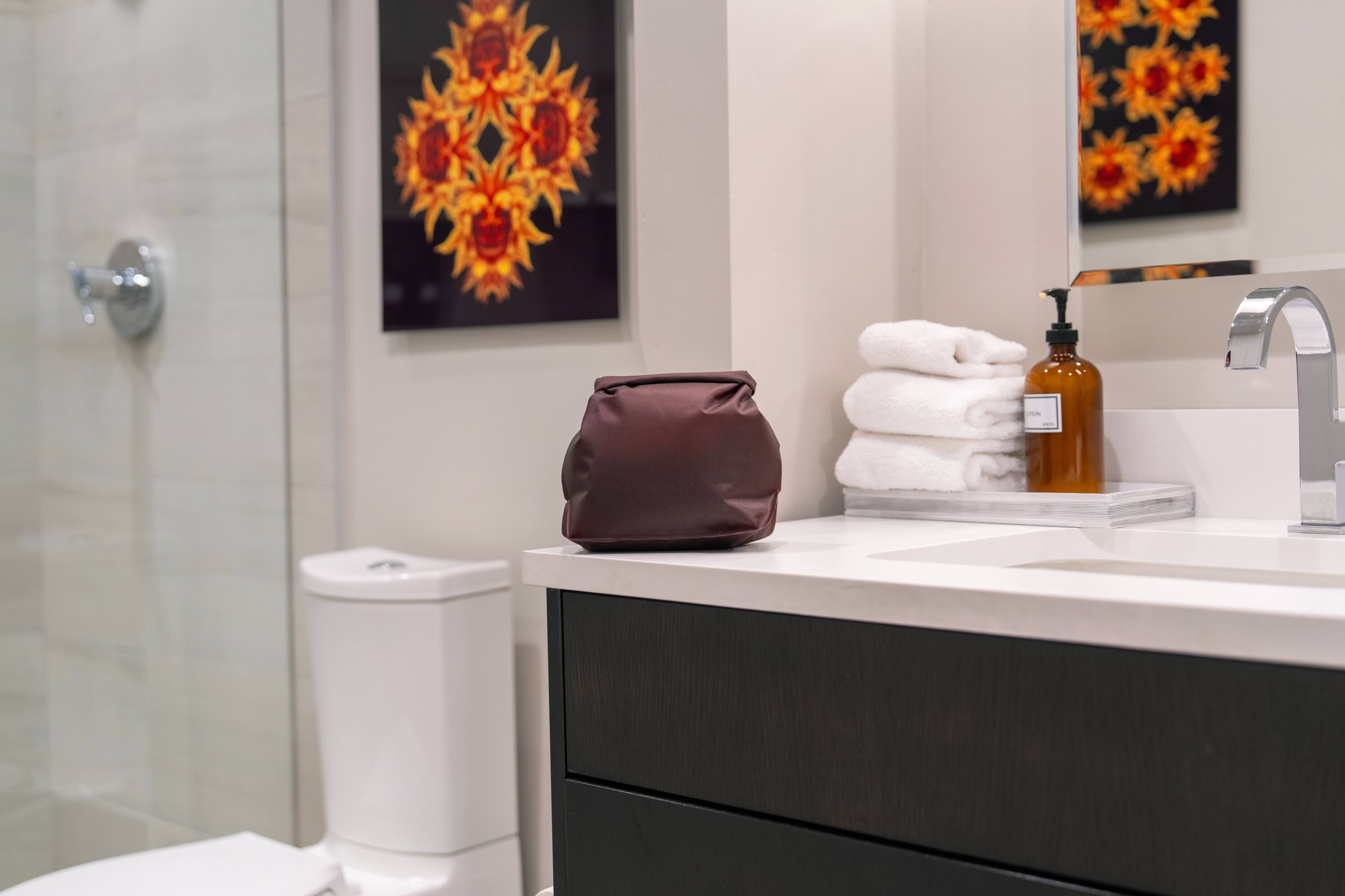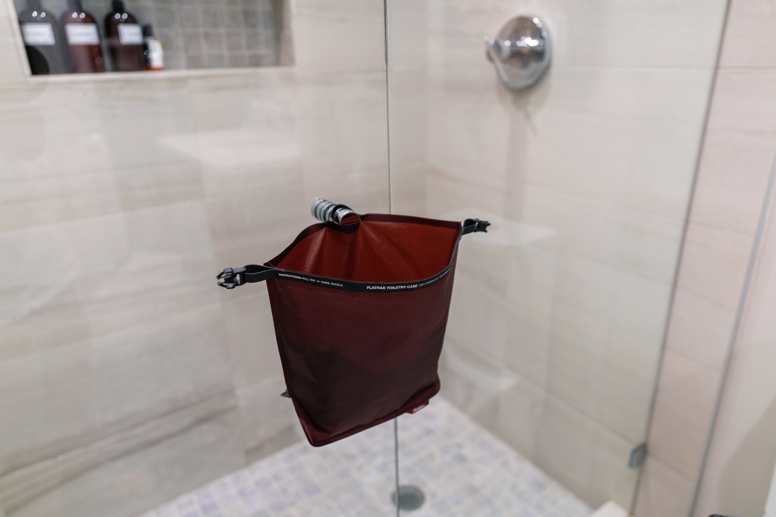 Verwenden Sie die Hypalon-Schlaufe zum Aufhängen des Kulturbeutels und als Duschablage. Das Design mit flachem Boden sitzt aufrecht auf geraden Flächen für einen einfachen Zugang. Geöffnet ist der gesamte Inhalt leicht einzusehen.