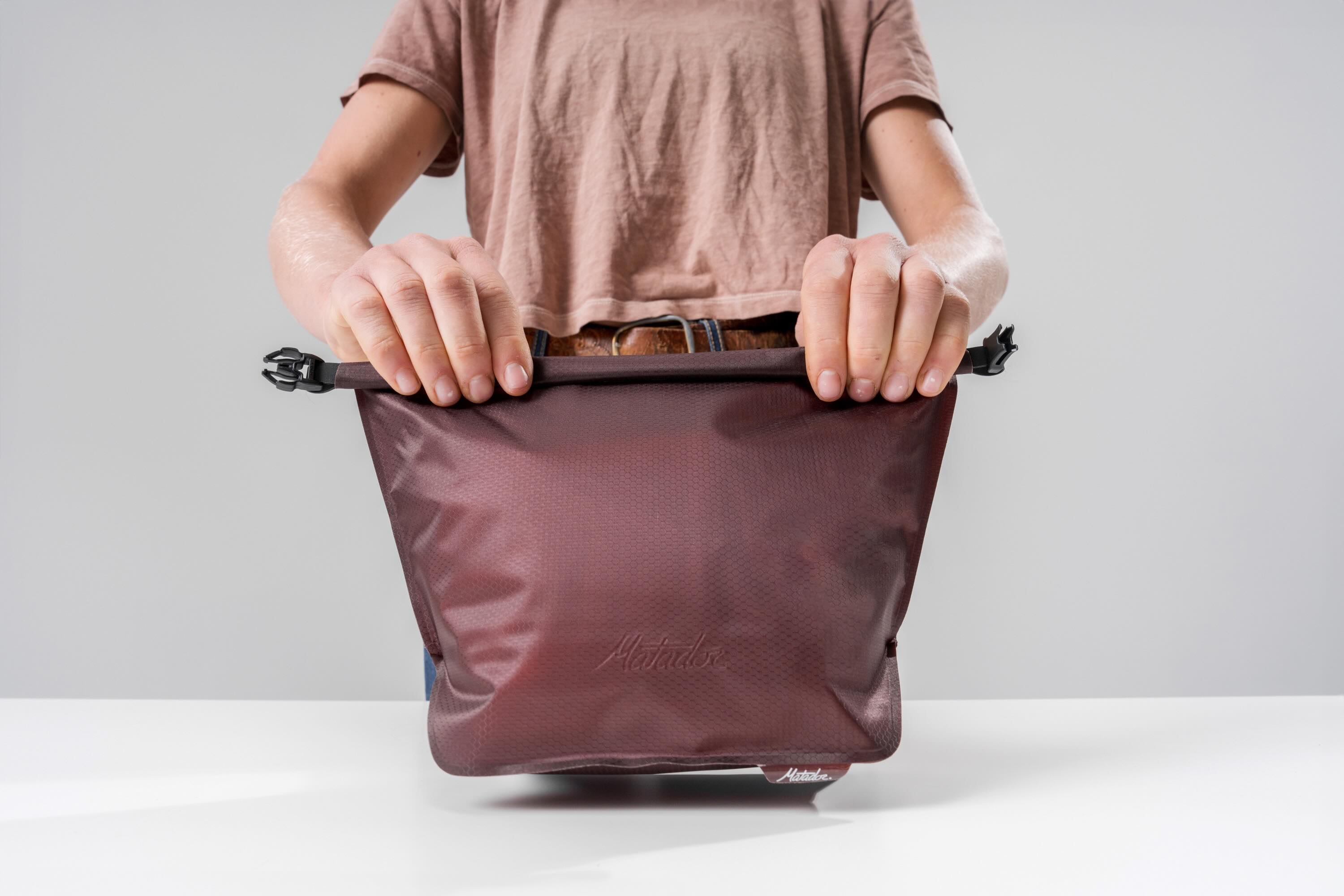 Die Rolltop-Öffnung und die geschweißte Konstruktion machen den Flatpak-Kulturbeutel wasserdicht und auslaufsicher.