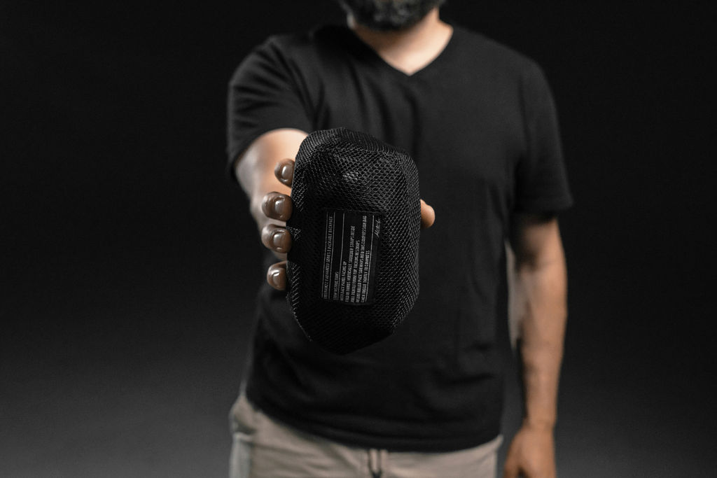 In den mitgelieferten Mesh-Kompressionssack verstauen, mitnehmen.